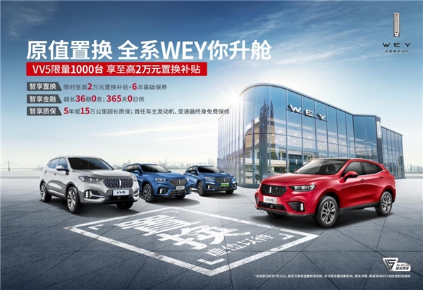根据VV5的置换规则,凡是长城品牌部分车型(C30)、哈弗品牌部分车型(H1、H2、H4、H5、F5、M6、H6、F7等系列车型)、WEY品牌全系车型,都能参加置换活动,且车龄不超过两年以及车况良好的话,就有机会实现100%原值置换。如果符合相关政策,还能享受2万的置换补贴。很遗憾,我没法享受这一福利,但好在,就算非长城系列车型也能享受1万元补贴的政策!