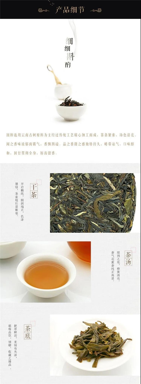 茶品“国粹”生茶,甄选自勐海布朗山大叶种晒青毛茶为原料,采摘自明前古树春茶,芽叶滋味丰富,传承古法制茶技艺,纯手工揉捻,人工石磨蒸压,历经十余道工序匠心精致而成。
