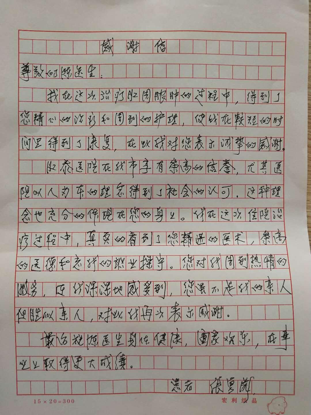原来,市民张先生因肛周脓肿在网上咨询了解到,大同肛泰肛肠医院是一家以治疗肛肠疾病为特色的专科医院,通过网上预约挂号后,通过手术治疗后得到了良好的恢复,患者为了表达对医院的医护人员为自己精心治疗和周到的护理,手写了一封感谢信来表达感激之情。