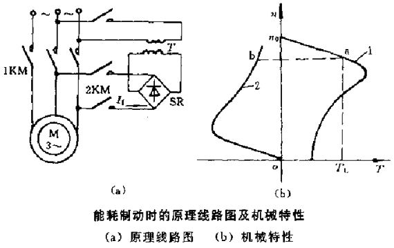 进行能耗制动时,首先将定子绕阻从三相电流电源断开(1KM打开),接着立即将一抵押直流电源统入定子绕阻(2KM闭合)。直流电流通过定子绕阻后,在电动机内部建立一个固定不变的磁场,由于转子在运动系统存储的机械能维持下继续旋转,转子导体内就产生感应电势和电流,该电流于恒定磁场相互作用产生作用方向于转子实际旋转方向相反的制动转矩,在它的作用下,电动机转速迅速下降,此时运动系统贮存的机械能被电动机转换成电能后消耗在转子电路的电阻中。