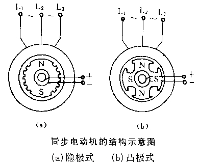 与同步电机一样,同步电机也分定子和转子两大基本部分。定子由铁心、定子绕阻(又叫电枢绕阻,通常是三相对称绕阻,并通有对称三相交流电流)、机座以及端盖等主要部件组成。转子包括主磁极、装在主磁极上的直流励磁绕组、特别设置的鼠笼型启动绕阻、电刷以及集电环等主要部件。由于同步电动机中作为旋转部分的转子只通以较小的直流励磁功率,故同步电动机特别适用于大功率高电压的场合。